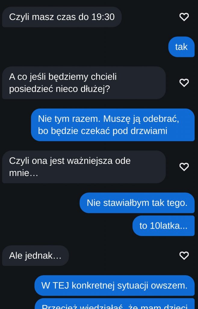 Mniej komfortowo poczułem się w innej sytuacji. Dziewczynie nie przeszkadzała moja sytuacja. Wiedziała, że mam dzieci i że zazwyczaj są pod moją opieką. I uznała, że w stanie ten stan rzeczy zaakceptować.