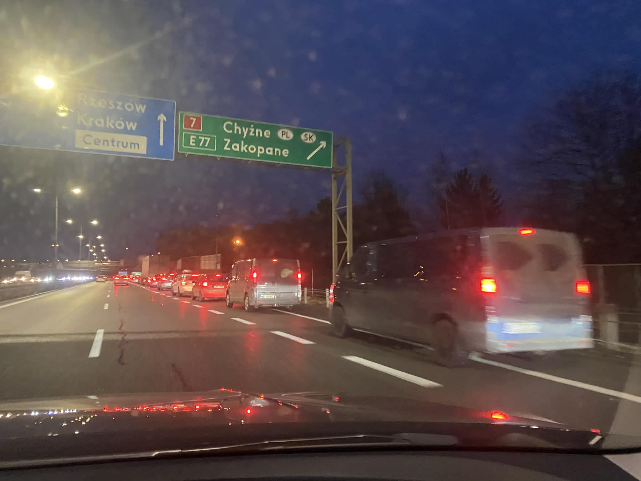 Kierowcy jadą trzema pasami, ale na dojeździe do zjazdu w stronę Zakopanego robi się klasyczne zwężenie w praktyce do jednego kierunku. Wiele aut próbuje minąć na końcu na pas prowadzący na zjazd, przez co hamowanie jest nagłe, a korek rośnie szybciej niż powinien.