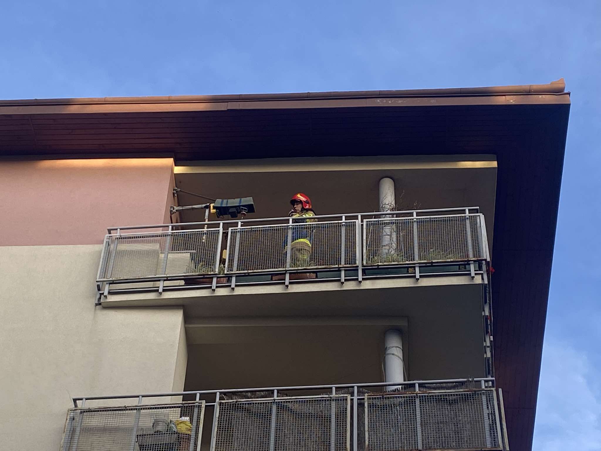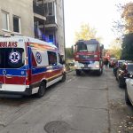Na miejscu pracują strażacy i pogotowie ratunkowe. Trwa akcja ratunkowa. Z płonącego mieszkania strażacy uratowali psa.