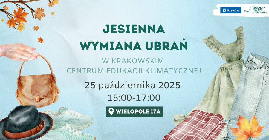 Początek jesiennych porządków to dobry moment na odświeżenie swojej szafy i zrobienie miejsca na cieplejsze ubrania. W Krakowskim Centrum Edukacji Klimatycznej przy ul. Wielopole 17a nadarzy się okazja, aby zrobić to w duchu zero waste – w sobotę, 25 października, odbędzie się tam comiesięczna wymiana ubrań. Wydarzenie rozpocznie się o godz. 15:00.