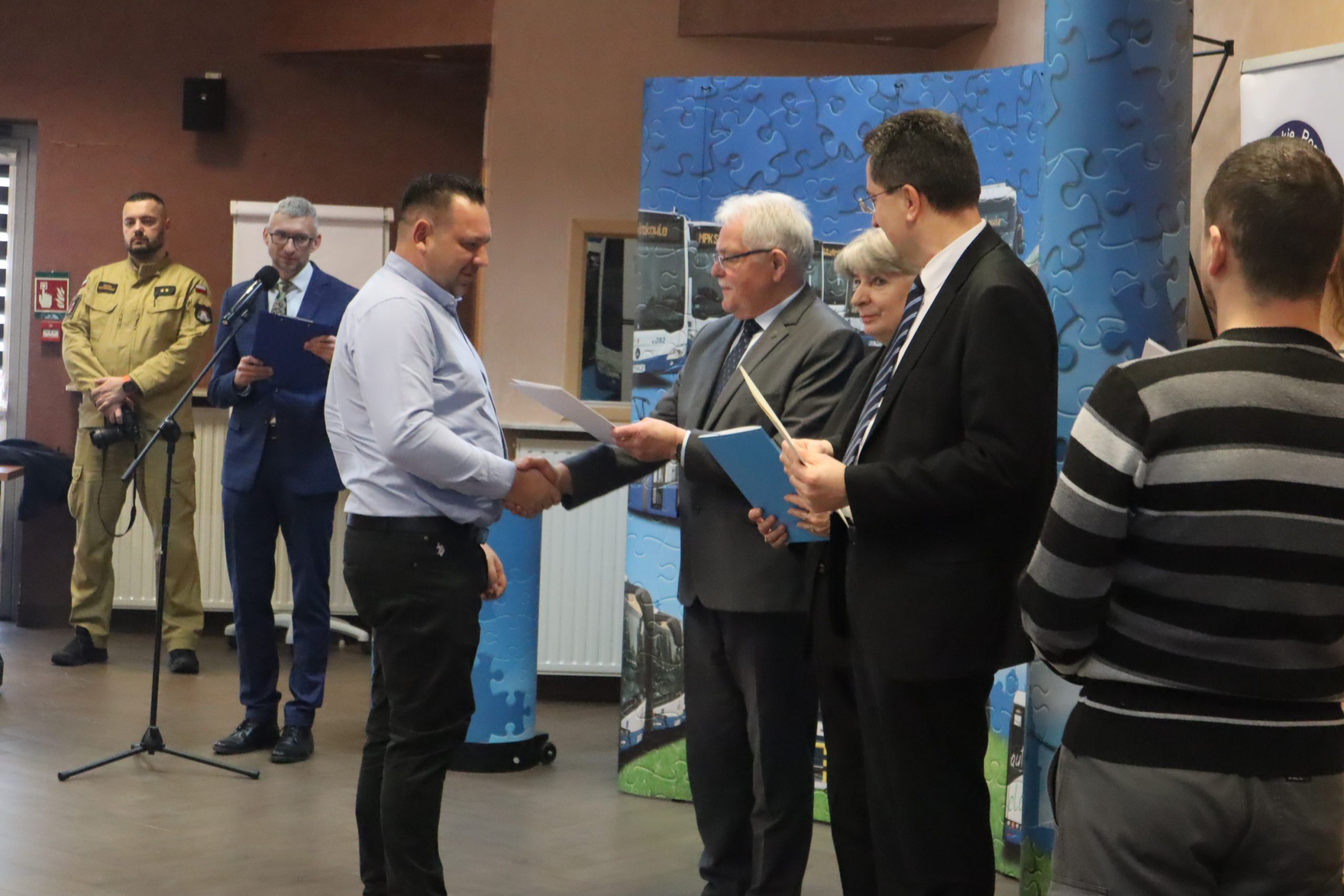 Kierowca Grzegorz Zięba, który uchronił pieszych przed potrąceniem przez samochód wyprzedzający autobus.