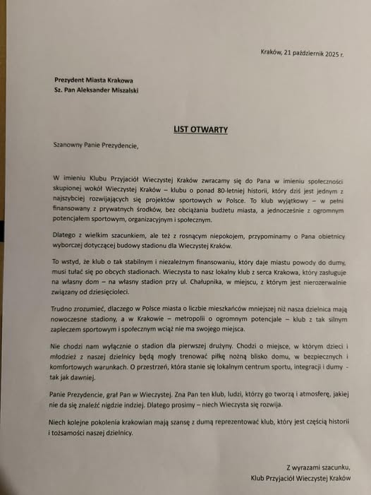 „Z wielkim szacunkiem, ale też z rosnącym niepokojem, przypominamy o Pana obietnicy wyborczej dotyczącej budowy stadionu dla Wieczystej Kraków. To wstyd, że klub o tak stabilnym i niezależnym finansowaniu, który daje miastu powody do dumy, musi tułać się po obcych stadionach” – pisali fani krakowskiego klubu.