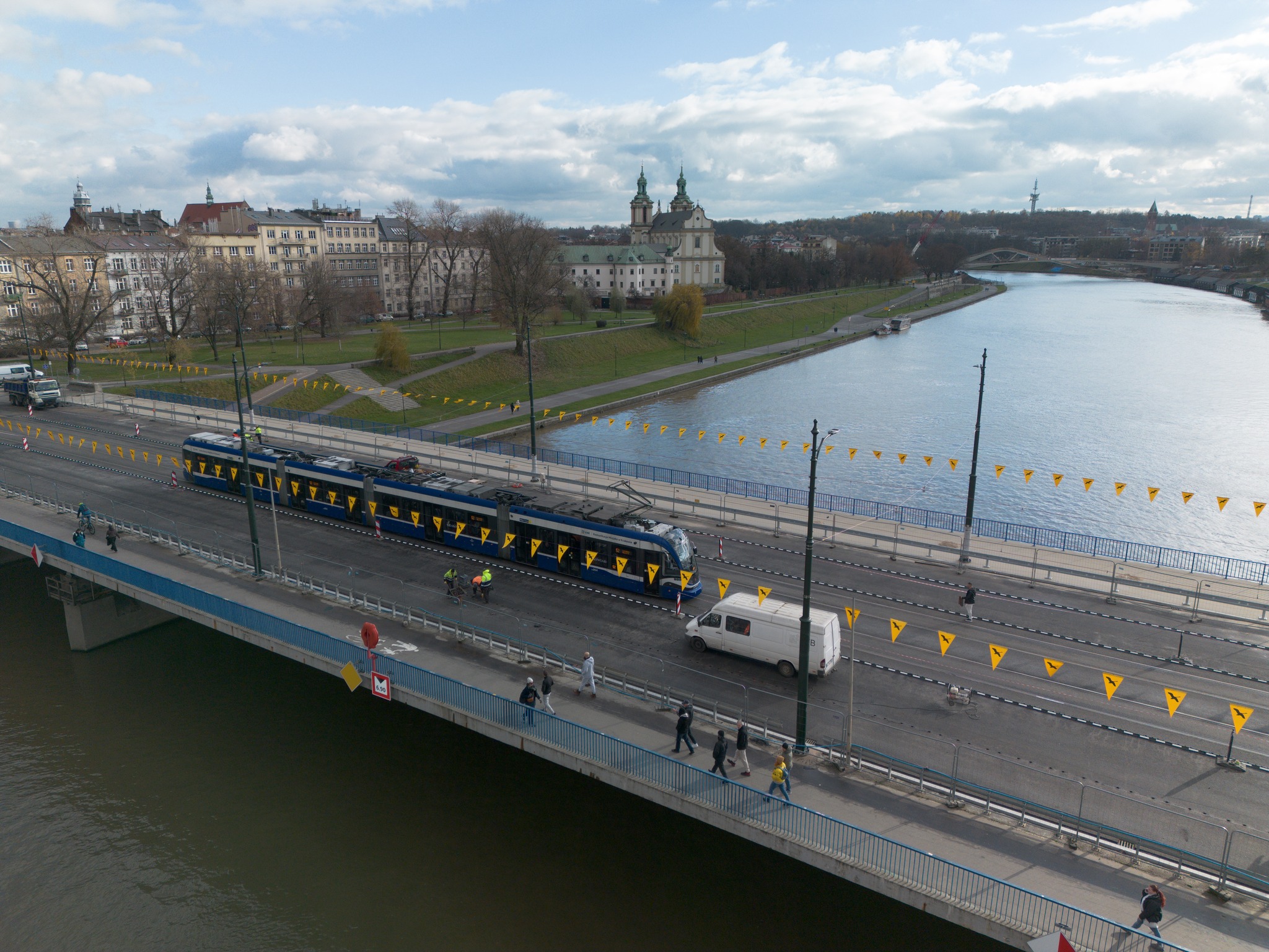 Od końca października mostem kursują tramwaje. Robotnicy ukończyli już większość najważniejszych robót. Ułożyli nową nawierzchnię i zamontowali separatory, które oddzielają torowisko od jezdni. Ekipy wyremontowały także chodnik po stronie Skałki.