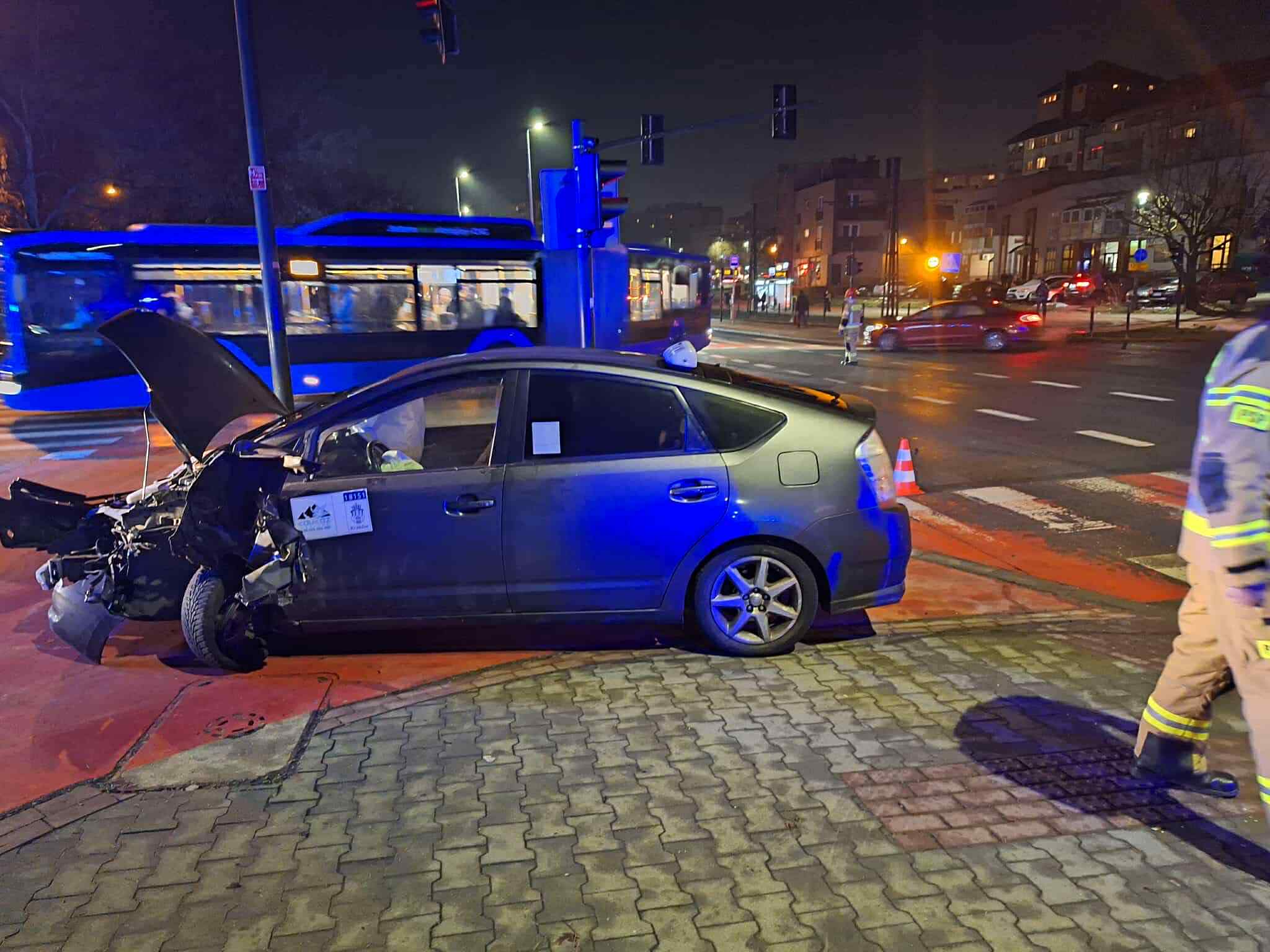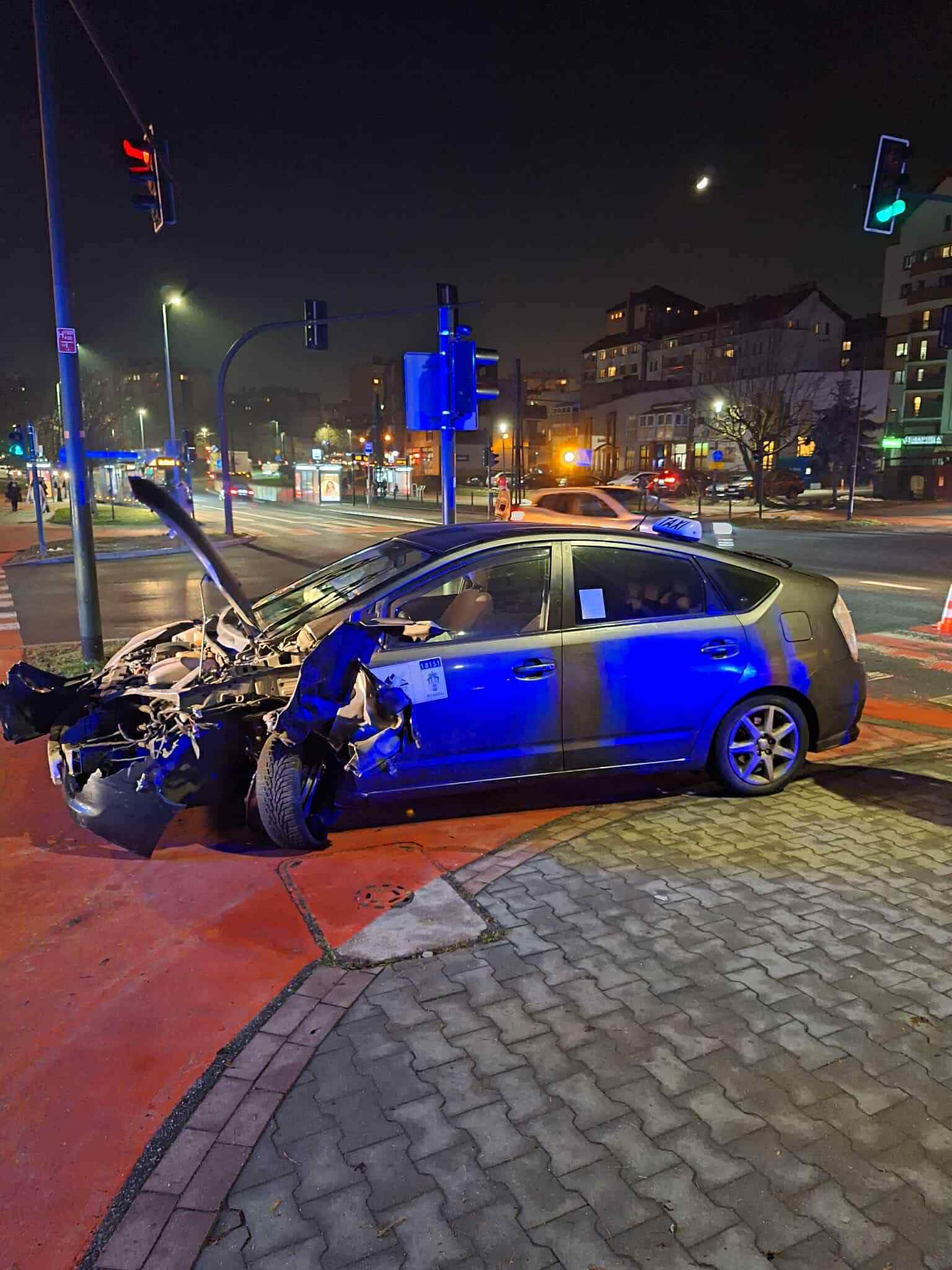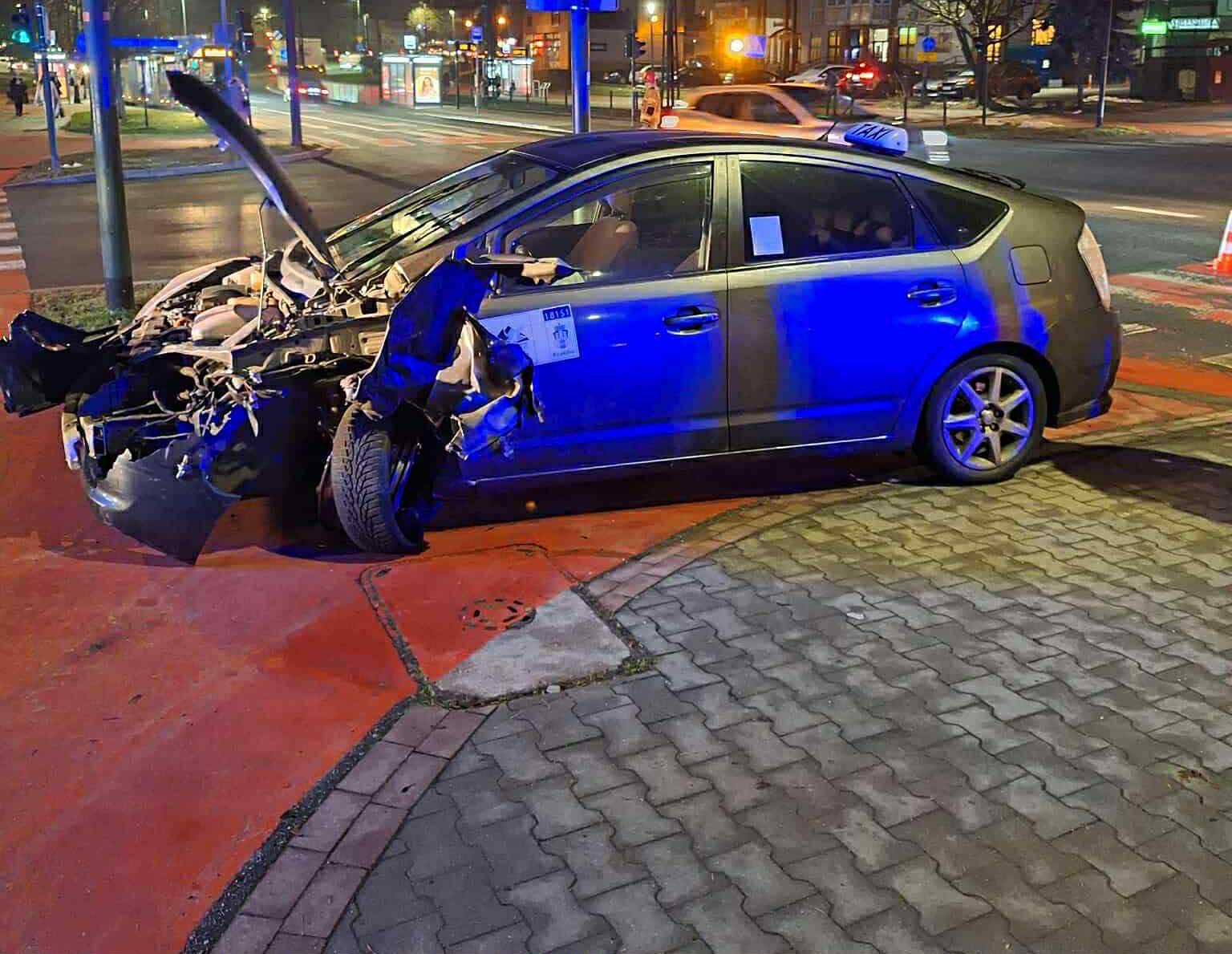 Do zdarzenia doszło na odcinku ulicy Piasta Kołodzieja. Według wstępnych informacji taksówka zderzyła się z samochodem osobowym, bo wymusiła pierwszeństwo, a siła uderzenia była na tyle duża, że jedno z aut wypadło z jezdni.