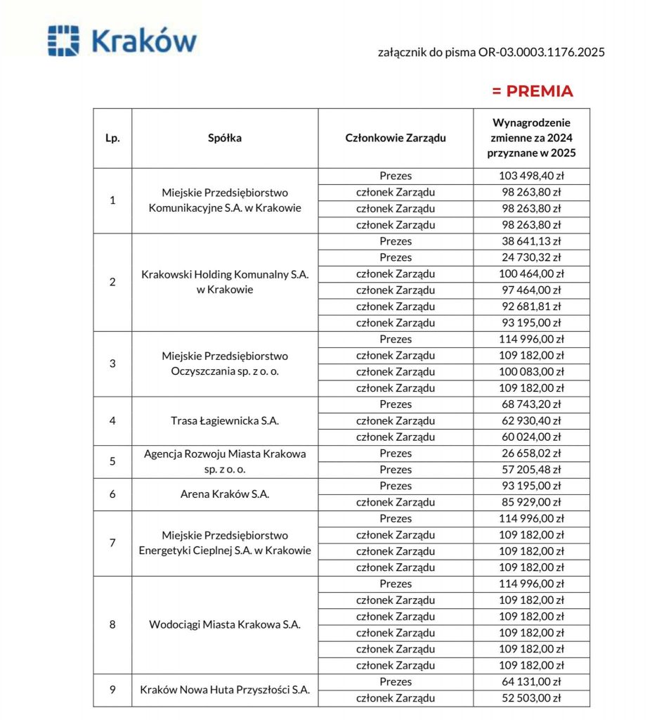 Zarządy krakowskich spółek komunalnych dostały w 2025 roku premie na łączną kwotę niemal 3 milionów złotych brutto. Magistrat opublikował dane po interwencji radnego Łukasza Gibały z klubu Kraków dla Mieszkańców.