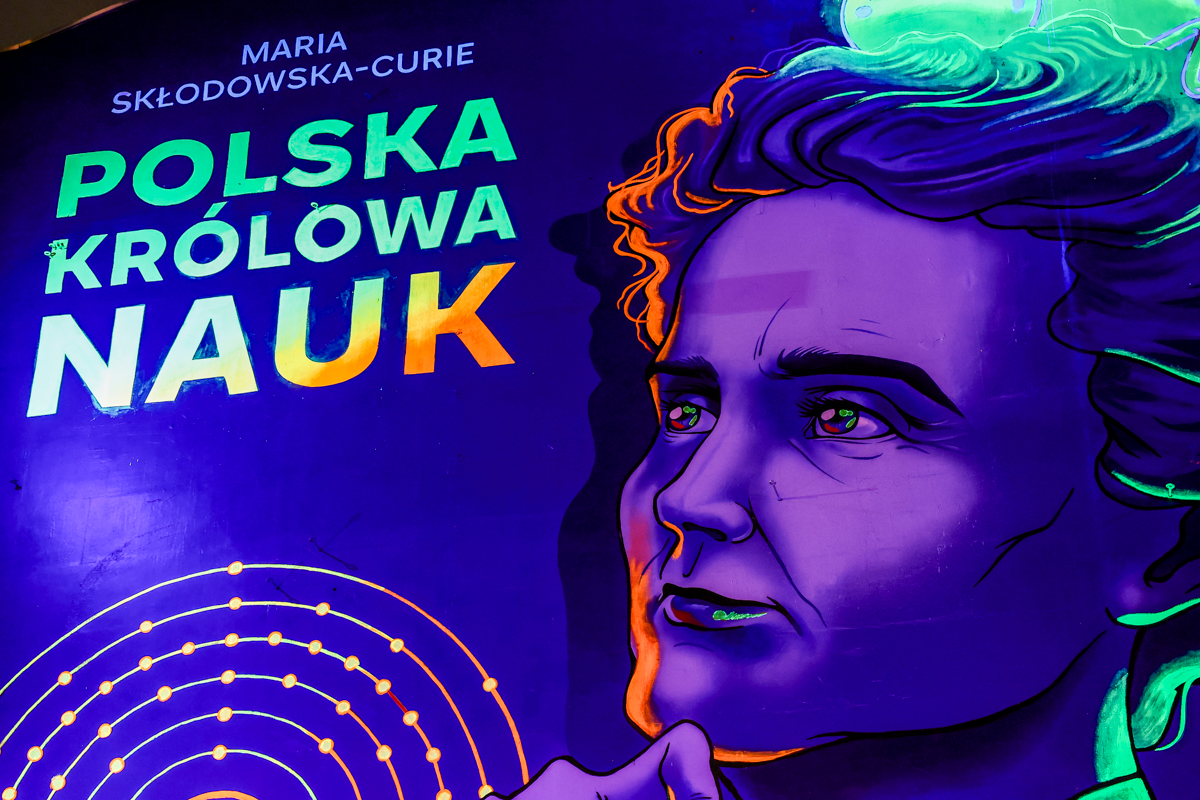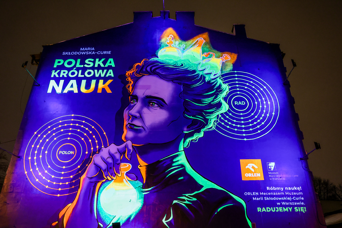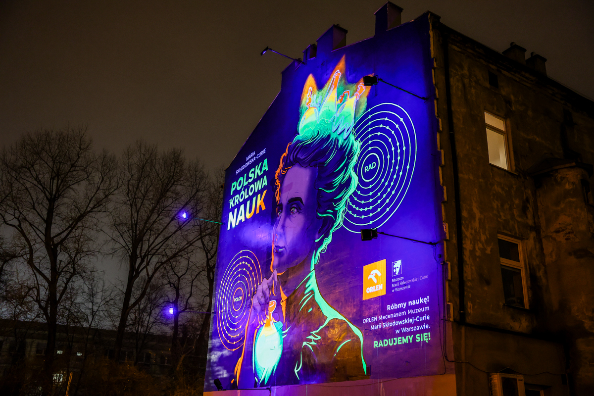 Murale to efekt współpracy Orlenu z Muzeum Marii Skłodowskiej-Curie w Warszawie. Projekt graficzny przygotowała Aleksandra Marchocka, a malowanie powierzono Good Looking Studio.