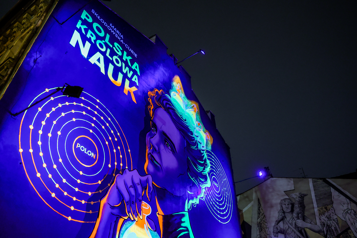 W Krakowie pojawił się wyjątkowy mural z wizerunkiem Marii Skłodowskiej-Curie. Obraz na budynku przy ulicy Grzegórzeckiej świeci po zmroku. I to nie przypadkowo.