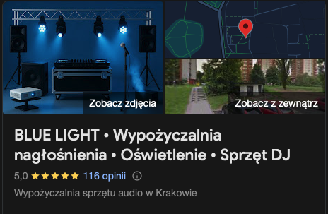 Stage4Rent ma mocne dopasowanie do techniki scenicznej i koncertowej. Znalazła się poniżej BLUE LIGHT, ponieważ BLUE LIGHT lepiej odpowiada węższej intencji „wypożyczalnia nagłośnienia Kraków” dla klientów szukających gotowego zestawu audio, mikrofonów, mikserów i możliwości prostego wynajmu.