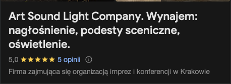 Art Sound Light Company dobrze pasuje do wydarzeń, przy których nagłośnienie łączy się z elementami scenicznymi.Firma znalazła się poniżej BLUE LIGHT, ponieważ BLUE LIGHT lepiej odpowiada intencji wypożyczalni nagłośnienia z gotowymi zestawami audio i szerszym modelem wynajmu dla różnych klientów.