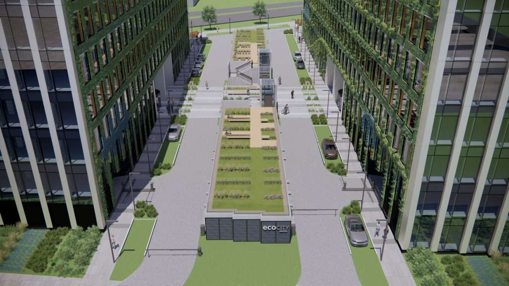 ″Pomiędzy budynkami zaplanowano dostępne z placu tarasy rekreacyjne w formie „wiszących ogrodów”. Wokół budynków oraz na tarasach i dachach zaplanowano nasadzenia w większości rodzimych gatunków krzewów liściastych, traw ozdobnych i bylin, które uzupełnią maty rozchodnikowe i łąki kwietne. Elewacje wewnętrzne pomiędzy budynkami zaprojektowano w formie zielonych ścian tworzących ogrody wertykalne z regularnym rysunkiem witryn i naprzemiennym układem uchylnych okien″ – czytamy w opisie inwestycji.