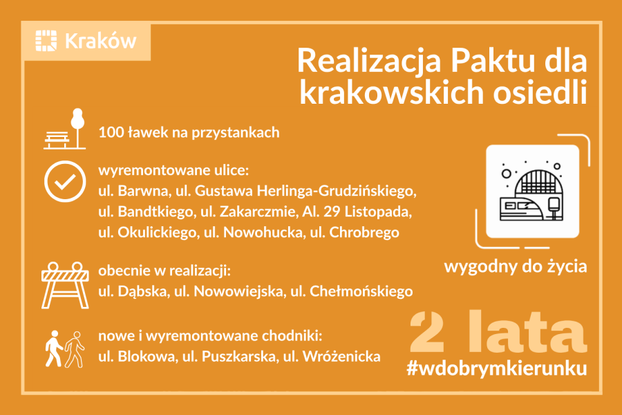 Przez pięć lat miasto wyremontuje 250 kilometrów dróg. Nowe i odnowione chodniki powstaną na łącznym odcinku 159 kilometrów. Oświetlenie pojawi się przy 500 przejściach dla pieszych. Na każdym przystanku komunikacji miejskiej stanie ławka. Miasto wymieni też kilkanaście tysięcy opraw oświetleniowych w całym Krakowie.