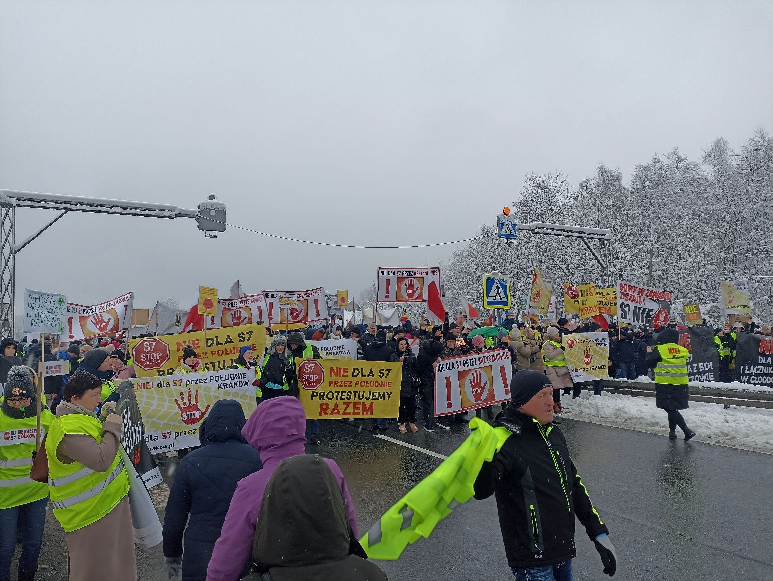 Fatalna pogoda nie odstraszyla protestujących. Na Zakopiance w Głogoczowie pojawiło się dziś około tysiąca mieszkańców. Policja wyznaczyła objazd przez Krzywaczkę i pilnuje porządku. Ludzie trzymają transparenty z hasłami „Nie dla S7” i „Stop dla S7”.