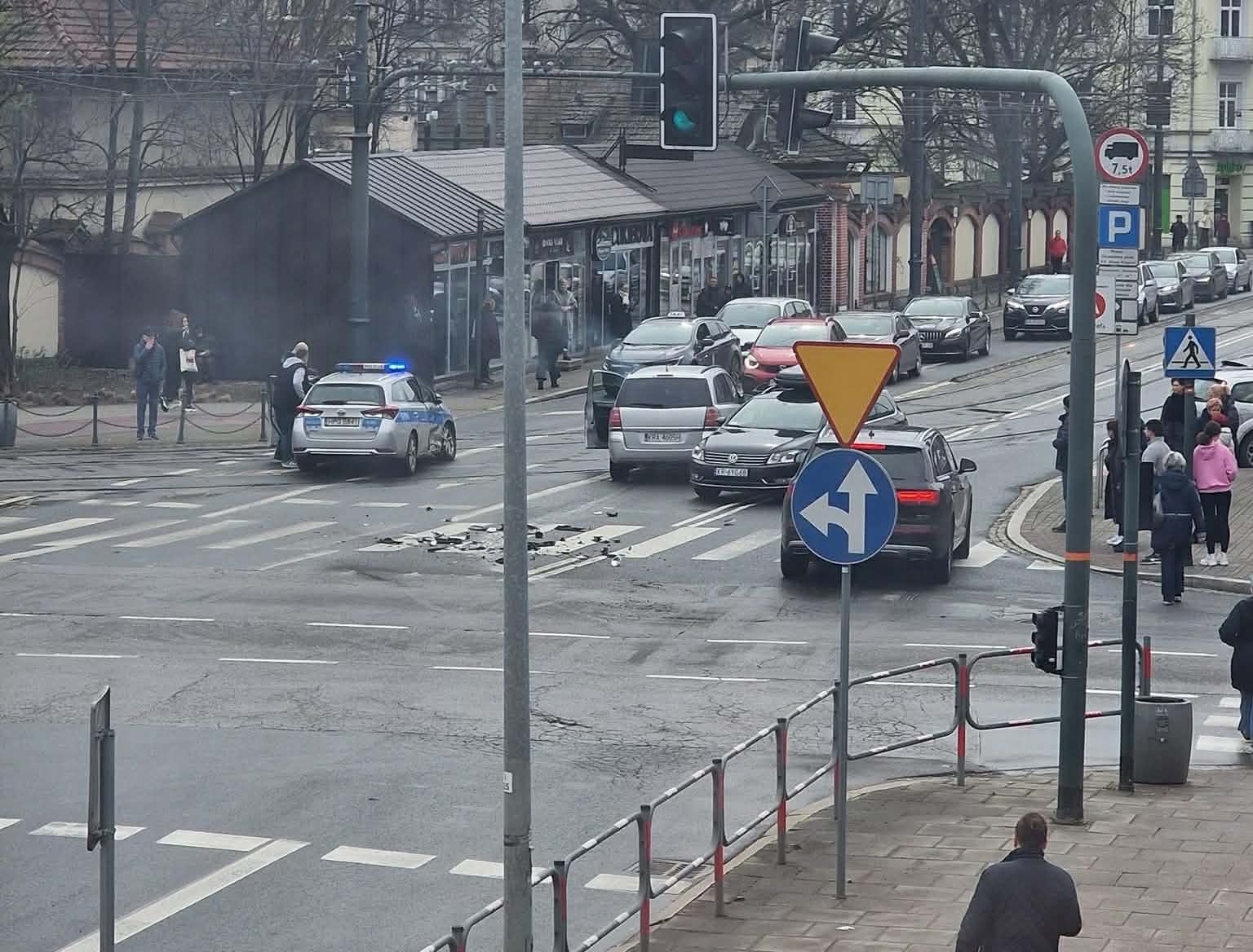 Policyjny radiowóz jadący na sygnale zderzył się z samochodem osobowym na skrzyżowaniu ulic Prądnickiej, Długiej i Słowackiego w Krakowie. Ulica Długa jest całkowicie zablokowana, a tramwaje stoją w miejscu.