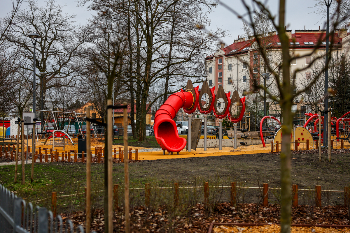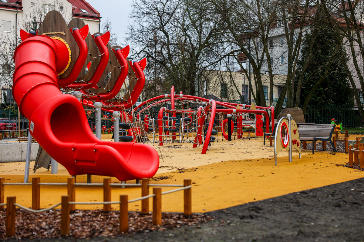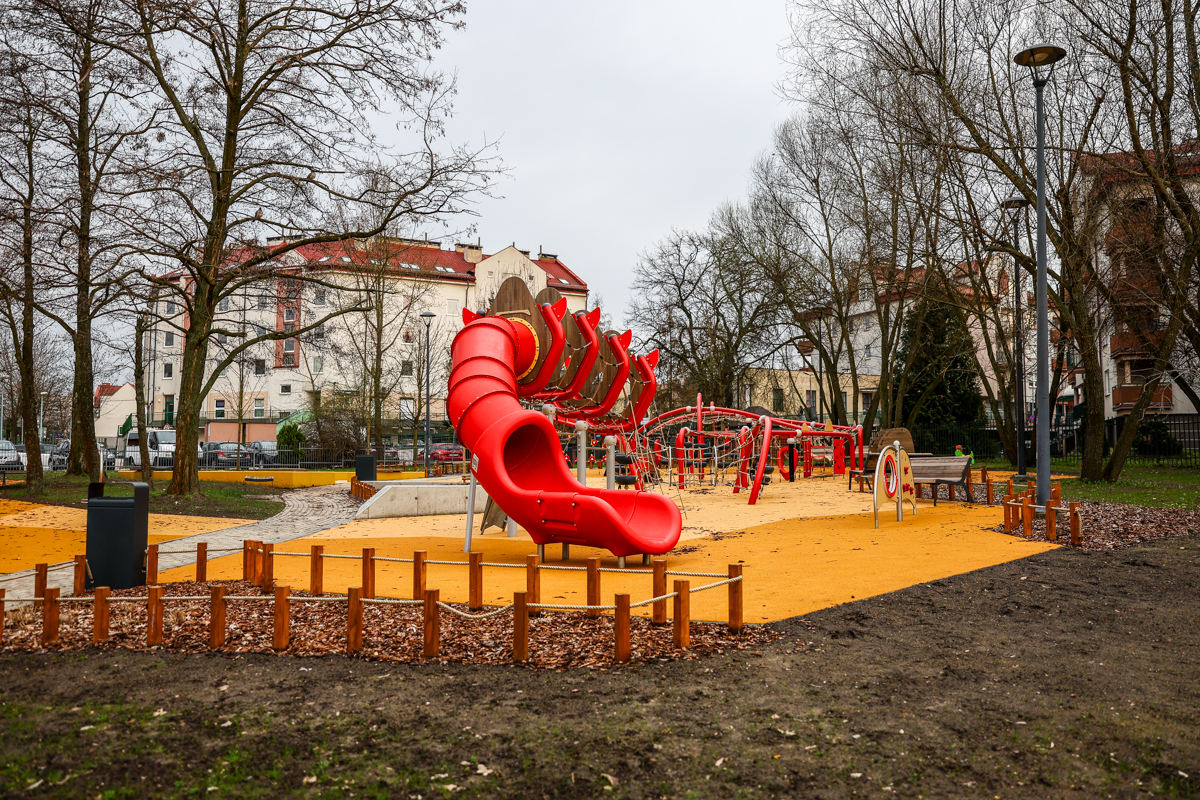 Plac zabaw zyskał zupełnie nowe oblicze. Robotnicy zdemontowali stare urządzenia i nawierzchnię, a w ich miejsce pojawiły się nowoczesne elementy małej architektury. Największą atrakcją jest rzeźba do zabawy w kształcie smoka – bezpośrednie nawiązanie do legendy o smoku wawelskim, które nadaje miejscu wyjątkowy charakter.
