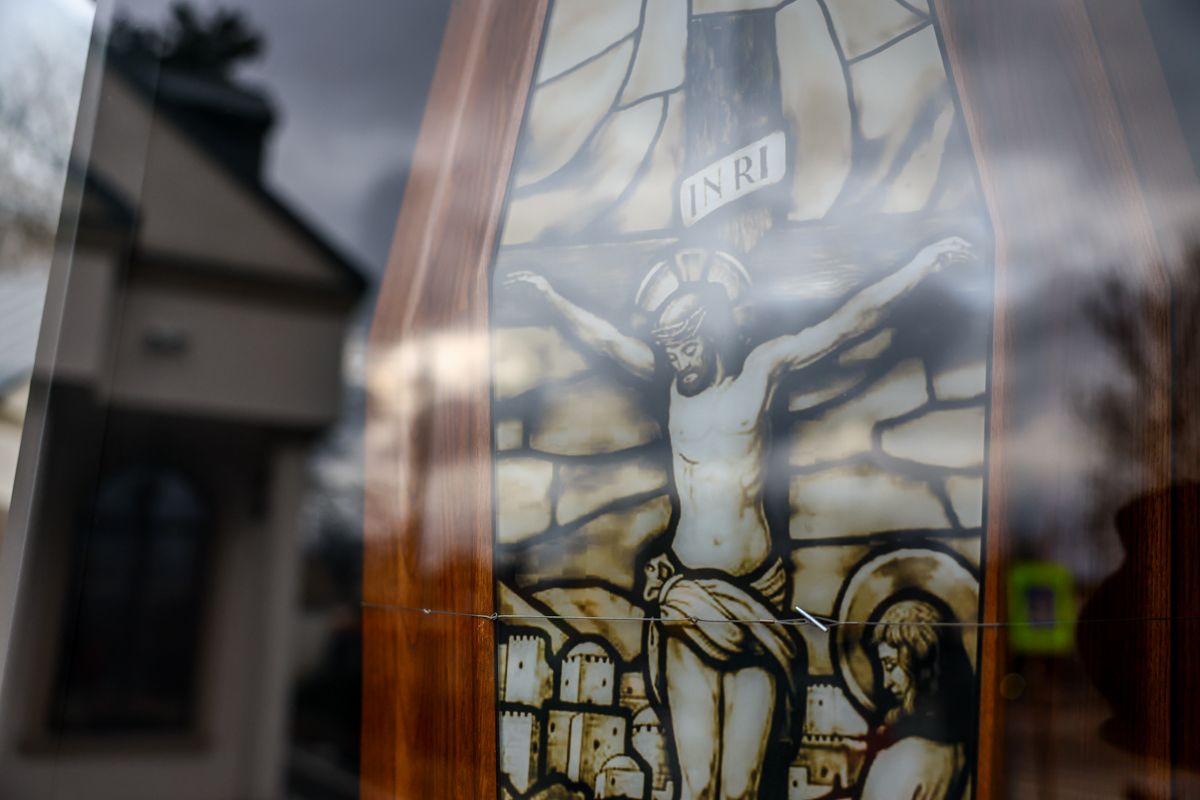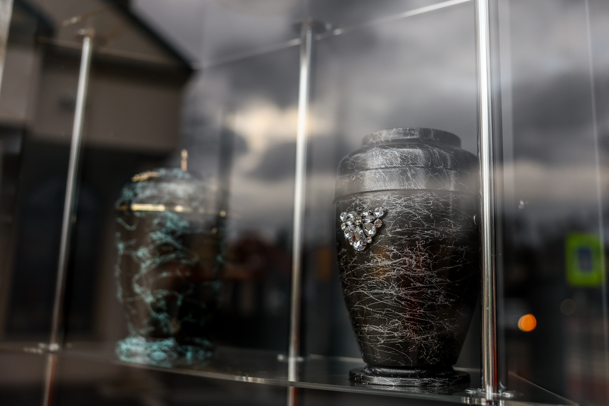 Ruchoma ekspozycja stoi przy punkcie firmy Karawan przy ul. Rakowickiej, tuż przy Cmentarzu Rakowickim. To element promocji usług i produktów związanych z branżą pogrzebową, ustawiony w miejscu, gdzie taki przekaz ma być najbardziej oczywisty.