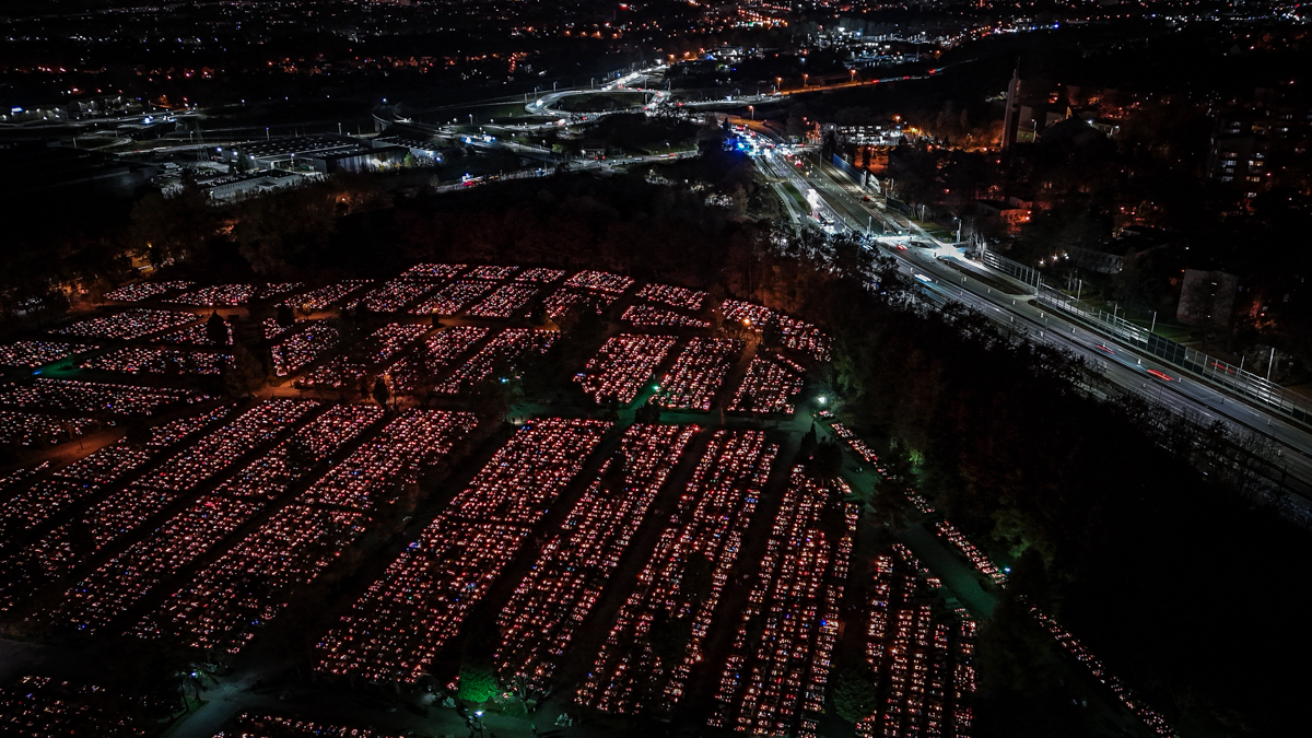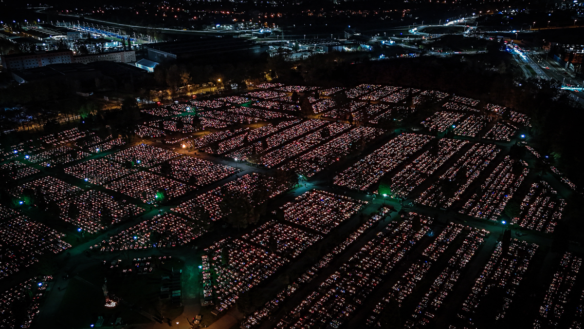 Kiedy słońce zaszło, efekt był jeszcze bardziej poruszający. Ciemność nocy kontrastowała z blaskiem zniczy. Z powietrza, z lotu ptaka, widać było każdy płomyk – jak maleńkie gwiazdy rozsypane po całym cmentarzu. To, co zwykle ludzie widzą z poziomu ziemi, z drona okazało się frappujące – cały cmentarz żyje, dyszy wspomnieniami.