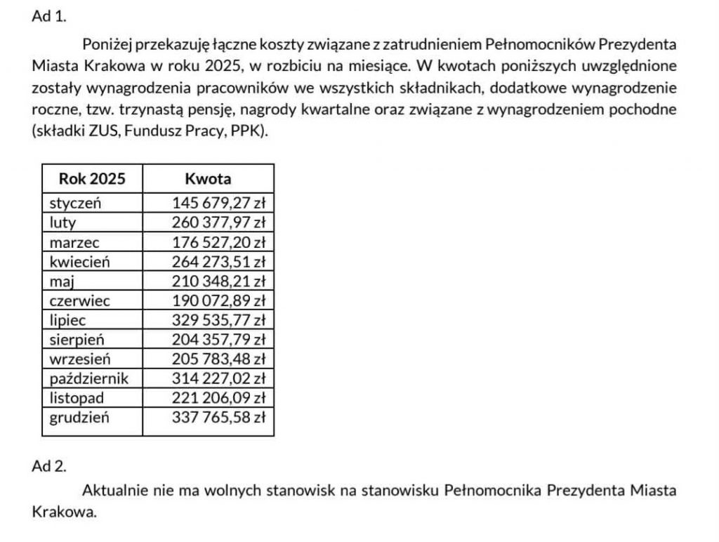 Ostatecznie w grudniu 2025 z budżetu miasta Krakowa na wynagrodzenia dla pełnomocników poszło 337 tysięcy złotych.