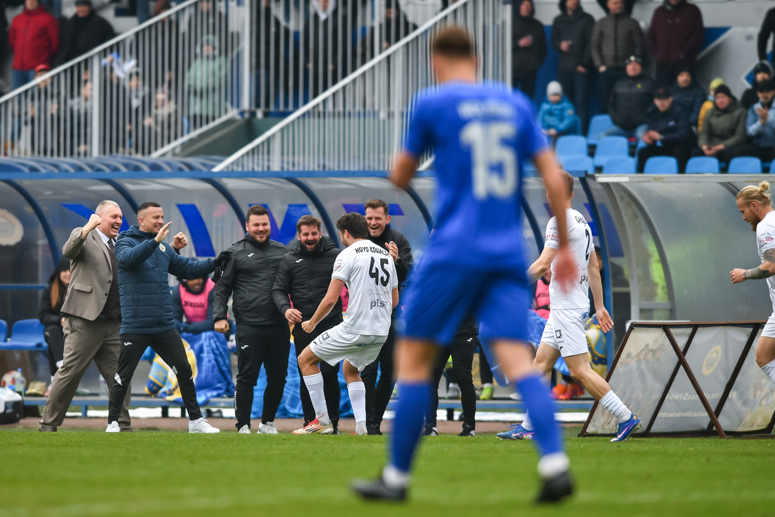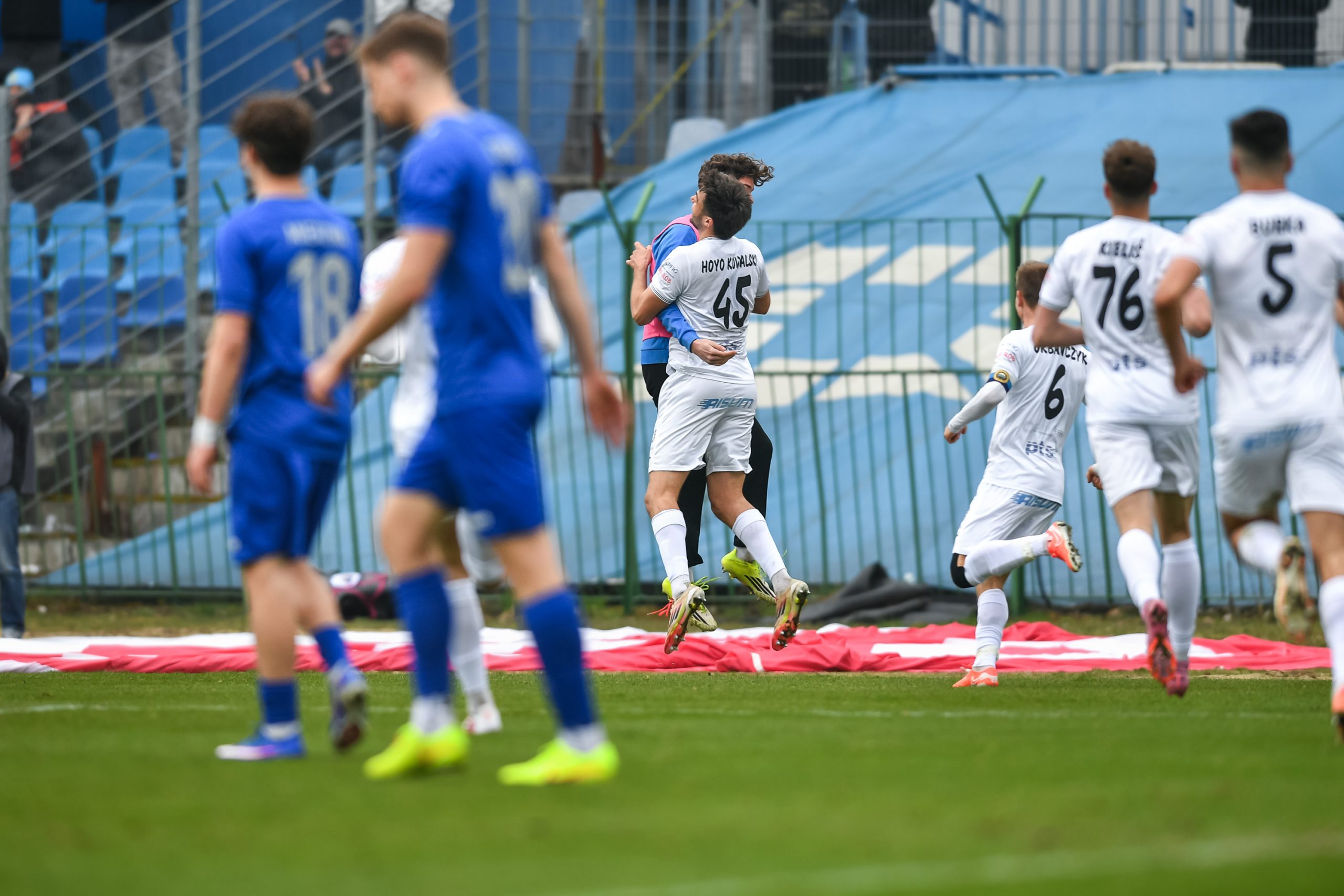 W 32. minucie Hutnik wyszedł na prowadzenie. Zawada przedarł się prawym skrzydłem i dośrodkował na dalszy słupek. Hoyo-Kowalski wyskoczył najwyżej i skierował piłkę głową przy lewym słupku bramki Murawskiego. Goście nie potrafili odpowiedzieć przed przerwą, choć to oni dominowali w posiadaniu piłki.